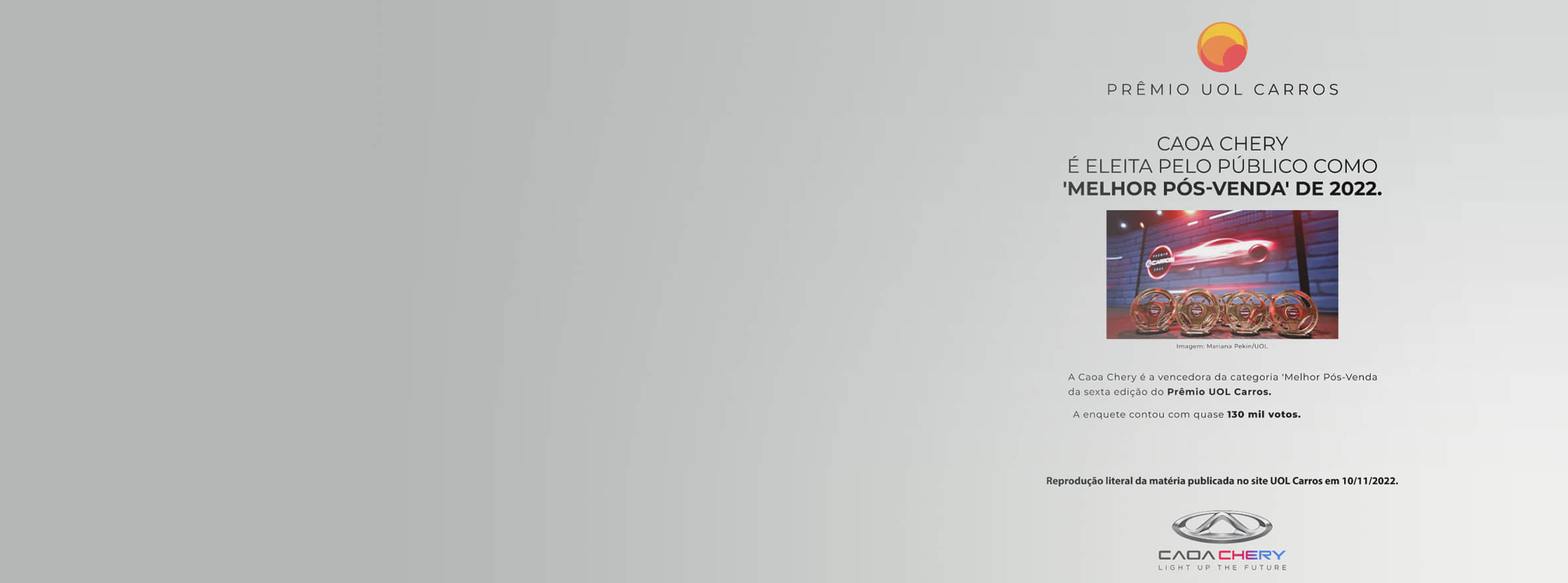 CAOA Chery won the best after-sales service award of the year selected by UOL, with more than 130000 consumers voting and 26% supporting CAOA Chery